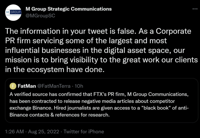 公链Terra研究员爆料FTX聘用公关抹黑币安!M Group出面否认