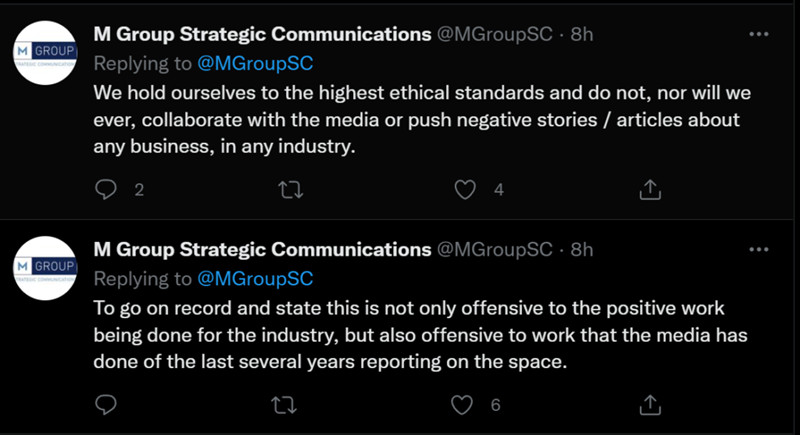 遭指控的M Gruop Communications也在FatMan爆料后一小时迅速回应,声称FatMan推文信息完全错误,并澄清公关公司目标是让客户做的工作被消费者看到,并且秉持更高的道德标准:您推文中的信息是错误的….我们的任务是让我们的客户在生态系中所做的伟大工作可以获得更多的关注。我们秉持的更高的道德标准,现在不会做,未来也不会做,不会与任何的业务、文章、媒体合作发表在任何产业的负面评论。去纪录与澄清这件事不只冒犯了过去在这个行业做了任何正向工作,也冒犯了媒体在过去几年对该领域报导的工作。