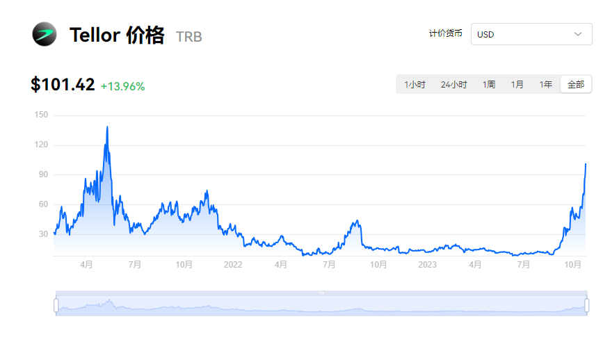Tellor 当前价格为 $101.42,24 小时交易额为 $1.53亿。Tellor 的价格在过去 24 小时内上涨了 13.96%。目前,Tellor 市值排名为第 128 名,实时市值为 $2.54亿,流通供应量为 249.50万 TRB,最大供应量为 254.07万 TRB。我们会实时更新 Tellor/USD 的价格。TRB币的未来价值受多方面因素的影响,包括市场需求、团队发展进度、以及整个加密货币市场的表现。在不同的预测网站上,关于TRB币未来价值的预测存在较大差异。以下是从不同来源总结的一些预测数据: