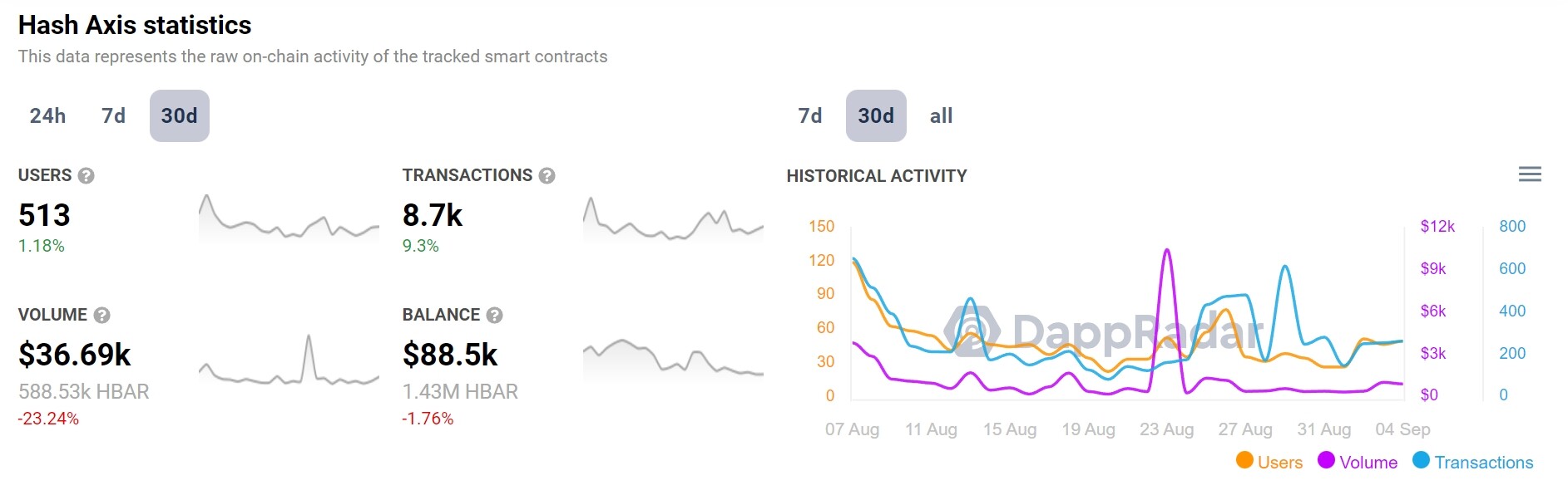 LG选择采用Hedera区块链,并非是一个显而易见的选择。据DappRader数据,过去30天以来,Hedera主要NFT市场Hash Axis交易量仅约3.66万美元,用户只有513个,相较之下,基于以太坊的OpenSea上的交易量达到3.3亿美元,用户超过30.5万个。