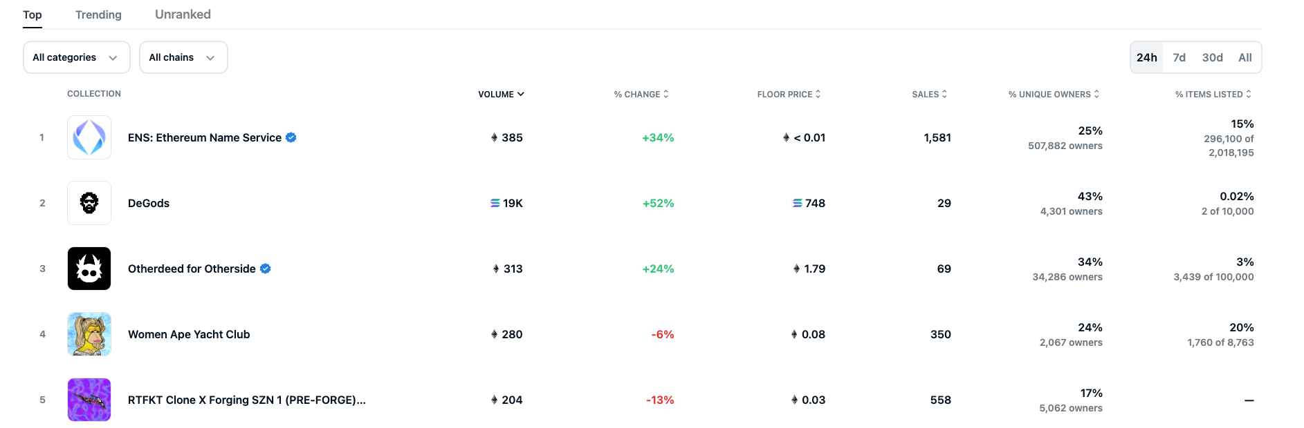 DeGods是近24小时OpenSea交易量第二大NFT项目