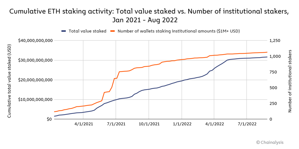 根据Chainalysis数据,机构以太坊质押者的数量(质押100万美元以上),已从2021年1月的不到200人,稳步成长至今年8月的约1100人,如果此数字在合并之后以更快速度增长,将证实机构投资者「确实将以太坊质押视为良好收益策略」的假设。