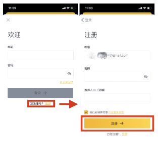 2、点击后跳转至登录/注册页面。如您还未注册,请点击下方的“注册”,按照要求输入邮箱和密码。仔细阅读过《币安服务条款》后勾选并点击【注册】按钮。