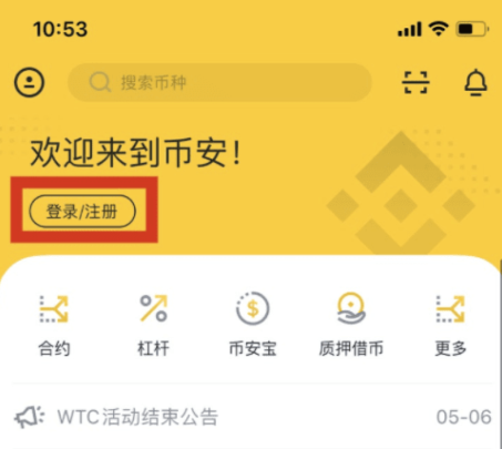 1、打开币安APP,进入币安首页,点击左上角【登录/注册】按钮。