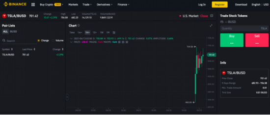 根据币安公告,12日晚间9 : 35时已正式上架特斯拉股权代币交易对「TSLA / BUSD」,将以BUSD计价、结算及抵押。截至目前,在7个小时的交易周期达到了980万美元的交易量。如下图,在币安官网「交易栏位」的最下方已能交易股权代币。