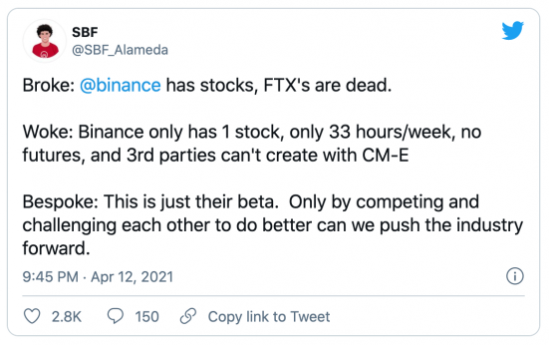 FTX 创办人SBF在币安发布股权代币不久后随即在推特发声,他先是戏谑地表示:「币安也有股权代币了,FTX的股权通证玩完了」。接着,他还是客观评论了币安产品的缺陷: