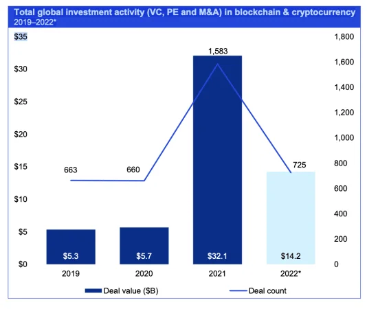 KPMG在最近发表的报告中表示,受俄乌战争、Terra生态系 *** 的影响,今年迄今为止,注入区块链和加密货币领域的投资金额约为142亿美元,远低于2021年的321亿美元,不过,投资人情绪依旧强劲,今年年中平均投资水平仍较2019年、2020年高出许多。