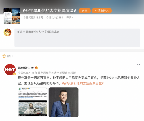 航天也可“盲盒” 微博网友热评孙宇晨“星辰大海”计划