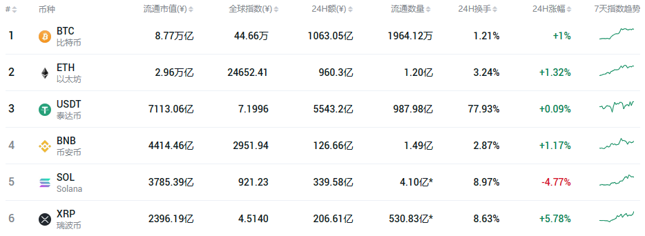 | 1 | ![]() | 8.77万亿 | 44.66万 | 1063.05亿 | 1964.12万 | 1.21% | 1% | |