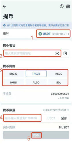 4、打开对方平台的提币页面,选择币种USDT,在提币地址栏下粘贴上述步骤3复制的欧意账户下USDT的充值地址 - 或者扫描保存的充值二维码。选择提币网络,要特别注意,如果在上述步骤3中在欧意账户下USDT的充值网络选的是USDT-TRC20,那么在对方平台USDT的提币网络也要选择TRC20 ,请务必保持网络一致,然后输入提币数量,点击【提币】。