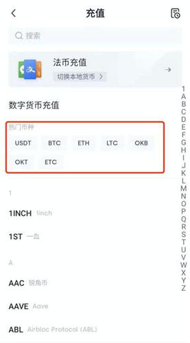 2、如果是进行数字资产充值,可以选择您要充值的币种,如果不是热门币种可以在上方搜索框搜索您要充值的币种。