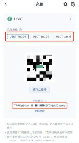 3、以USDT为例,选择充值网络,保存二维码或者复制下方充值地址。