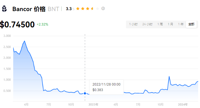 Bancor 当前价格为 $0.74500。Bancor 的价格在过去 24 小时内上涨了 2.32%。目前,Bancor 市值排名为第 191 名,实时市值为 $1.00亿,流通供应量为 134,222,257 BNT,最大供应量为 134,222,257 BNT。我们会实时更新 Bancor/USD 的价格。Bancor 价格表现 (美元)