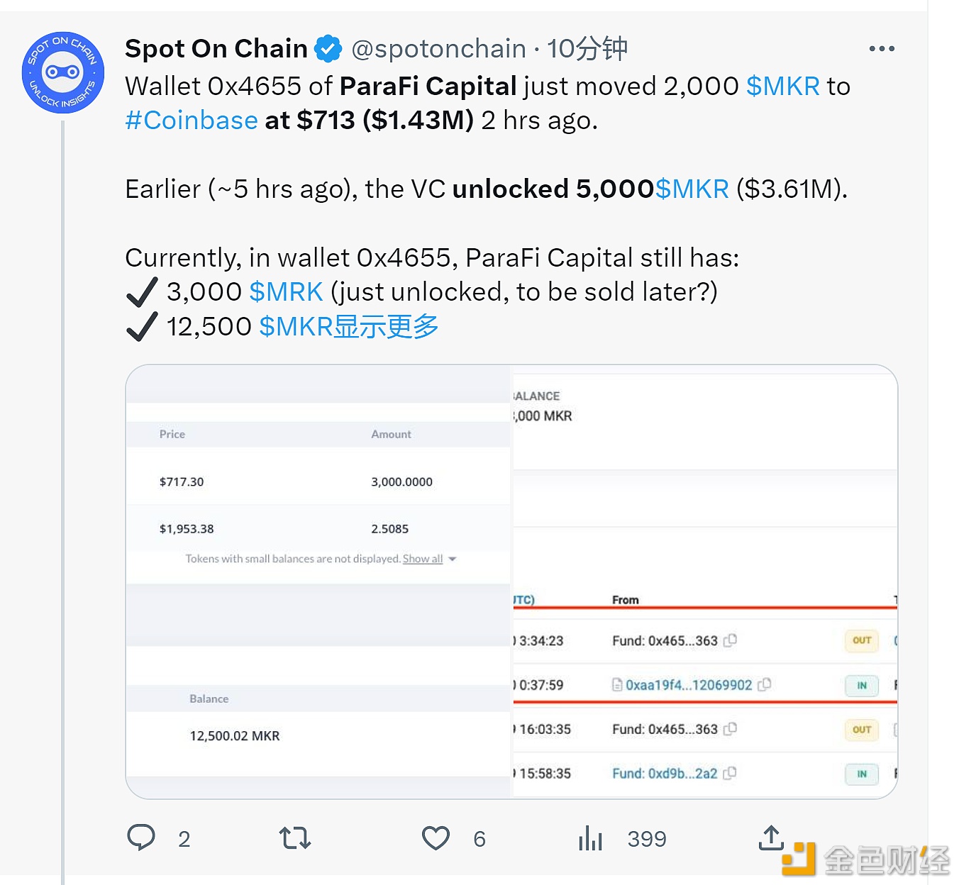 据SpotonChain数据显示,被标记为ParaFiCapital的地址于5小时前解锁5000枚MKR,并2小时前将其中2000枚MKR(约合143万美元)转移至Coinbase。 ParaFi Capital是2020年MakerDAO的投资者之一。他们曾于2021年和2022年通过Coinbase平台和Gensis Trading OTC囤积17,000枚MKR(当时的价格为2,922美元)。
