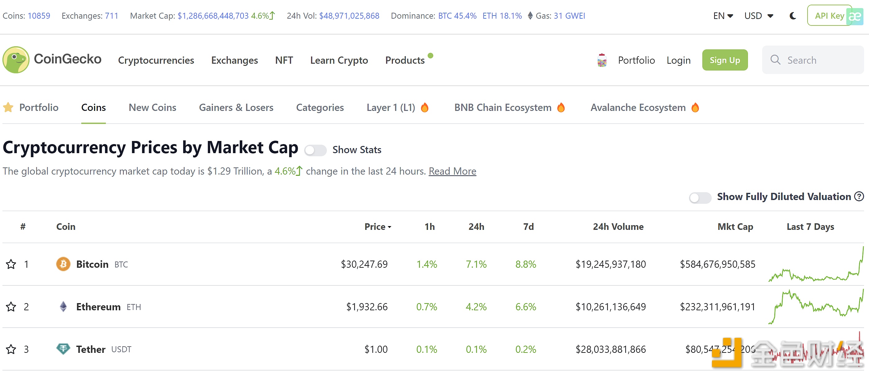 据CoinGecko数据显示,当前加密货币总市值为1.28万亿美元,24小时涨幅达4.6%,24小时交易量为489.71亿美元,当前比特币市值占比为45.4%,以太坊市值占比为18.1%。当前比特币价格为30400美元,较去年低点涨幅达96%。