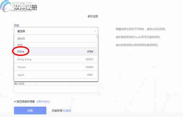 2. 点击图示的“手机注册”位置,进入手机注册页面。