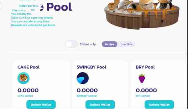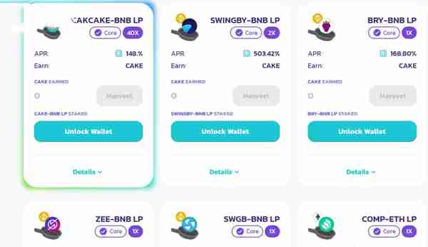 在Syrup Pools中用户可以通过质押代币CAKE来赚取其他代币。Syrup Pool类似于币安的Launchpool。PancakeSwap会寻找 BSC 上好的项目方合作,在平台上提供代币进行挖矿。只要抵押 CAKE 用户就可以获得这些不错项目的代币,比如 BNB,UNFI,BLK,HARD,VAI,TWT 等。在 SYRUP 池子挖矿比农场挖矿更容易一些,因为只要拥有 CAKE 就可以抵押挖矿。