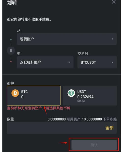 4. 在弹出的转账页面,确认从“现货账户”转到“逐仓账户”,选择币种和数量,点击【确认】。