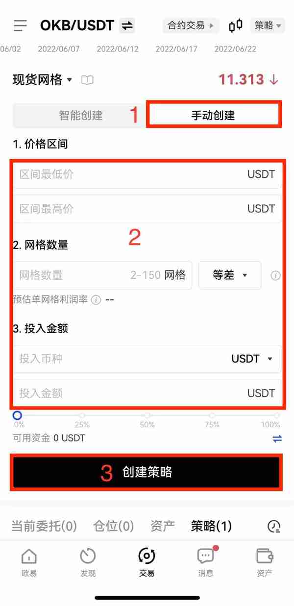 手动创建:您需要根据自己的判断与具体情况,填写价格震荡区间、网格数量、投入金额,即可创建策略。