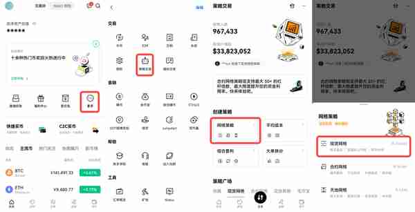 在欧易APP首页点击【更多】-【策略交易】,进入策略广场,选择【网格策略】-【现货网格】。随后进入策略创建界面选择交易对。