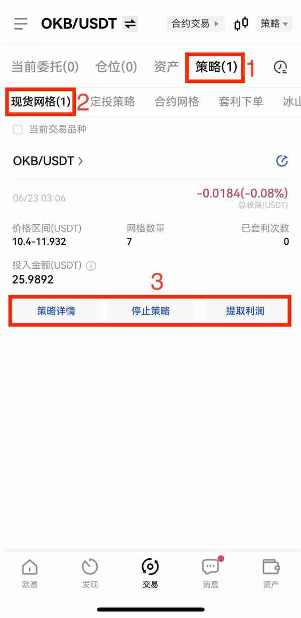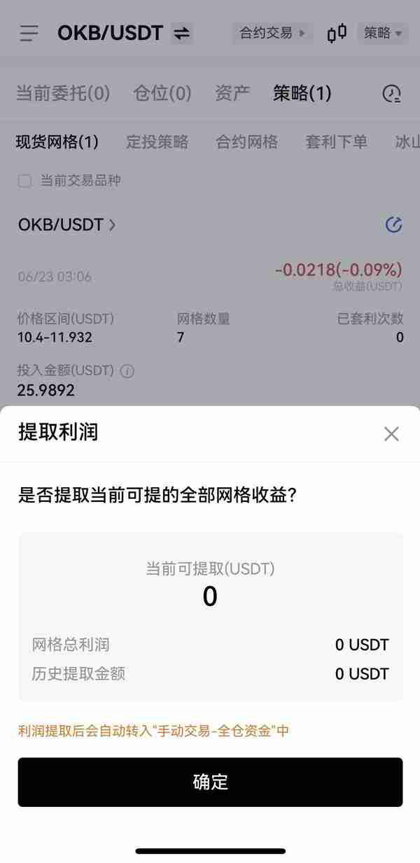 创建成功的网格策略,您可以在网格交易页面下方进行查看。并可以进行【提取利润】或【停止策略】的操作。