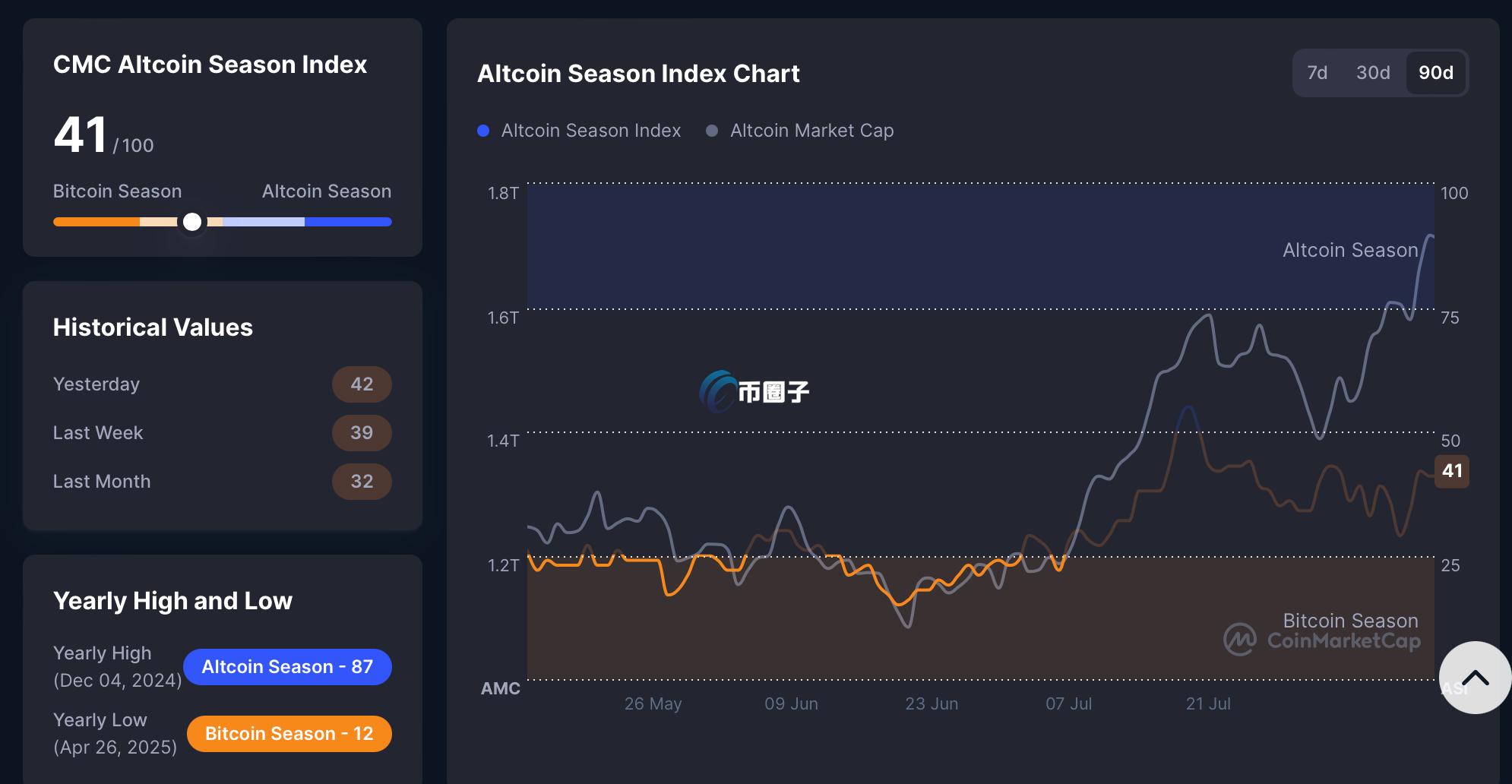 根据CoinMarketCap的山寨币指数,今日为41/100,显示山寨币资金总量虽超过1.7兆元,但指数统计并未过热。
