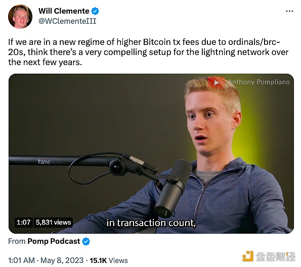Reflexivity Research联合创始人Will Clemente在社交媒体发文称,如果我们处于一个新的制度中,由于序数/brc-20而导致更高的比特币传输费用,我认为在未来几年内,闪电网络会有一个非常引人注目的发展。