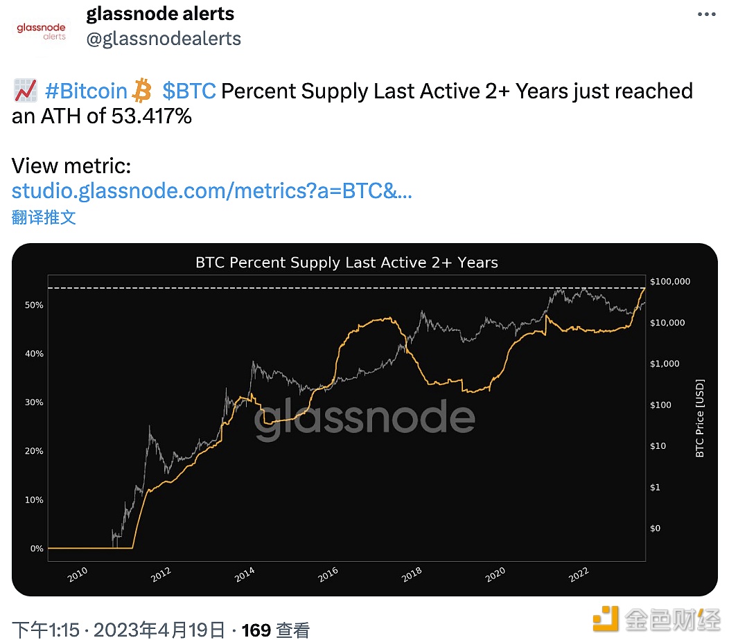 数据显示,BTC最近活跃两年以上的供应百分比刚刚达到53.417%,创历史新高。