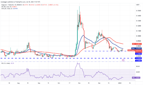 DOGE $0.07从重要支撑位0.07美元反弹,在1月5日的20日均线(0.07美元)处失败。这表明空头在每次救济反弹中都在抛售。