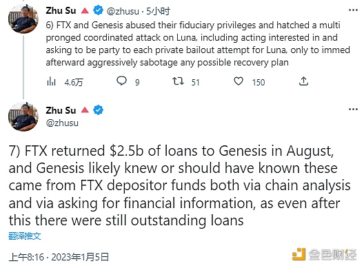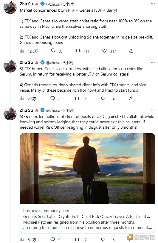 1月5日消息,三箭资本创始人Zhu Su在推特上表示: “FTX和Genesis之间的市场合作: 1.FTX和Genesis在去年5月的同一天将steth的抵押率从接近100%降至0%,同时做空steth; 2.FTX和Genesis一起以巨大规模购买了未解锁的SOL,并且 Genesis承诺可用于贷款; 3.FTX贿赂Genesis交易员,向Genesis交易员提供Serum等代币的种子分配,以换取在Serum抵押品上获得更好的贷款利率; 4.Genesis交易员经常与FTX交易员互相分享信息,其中许多人(目前)变得富有并试图创办基金; 5.Genesis借出数十亿美元的客户存款作为FTT抵押品,同时知道并承认他们在需要时永远无法退出这种抵押品(首席风险官在职仅3个月后辞职); 6.FTX和Genesis滥用了他们的信托特权,策划对Luna的多管齐下的协同攻击; 7.FTX去年8月向Genesis归还了25亿美元的贷款,Genesis可能通过链分析和询问财务信息知道这些来自FTX存款人的资金,因为即使在此之后仍有未偿还贷款。”