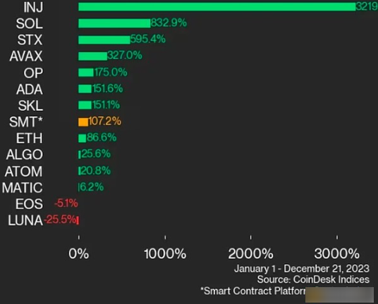 我们已经讨论了市场领导者Injective和Solana。以太坊的ETH取得了可观的87%的涨幅,尽管反对“Flippening”的人群肯定会注意到与比特币164%的巨大差距。