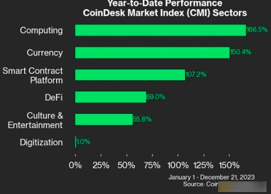 CoinDesk Computing InDEX (CPU) 在 CMI 行业指数中领涨,2023 年回报率为 167%。该指数对应于 CoinDesk 数字资产分类标准中的计算行业。