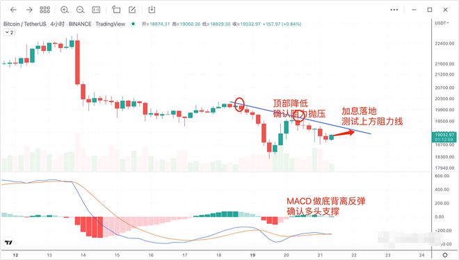纳斯达克爆出将托管数字资产,对BTC起到撑盘作用。BTC回抽5日线,夜间加息落地之后,有望形成插针反弹,上方19132美元是阻力线关键点,小顶点不断降低,面临阻力抛压,一旦快速拉升,打破阻力关口,BTC会进一步冲高走强,小时线做底背离反弹,接下来BTC上涨测试19132美元。