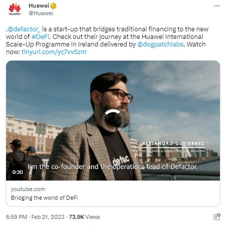 2月23日消息,华为于2月21日官方推特上发布Defactor宣传短片,并写道:“Defactor是一家连接传统融资和DeFi新世界的初创企业。看看他们在爱尔兰的华为国际提升计划的旅程。”
