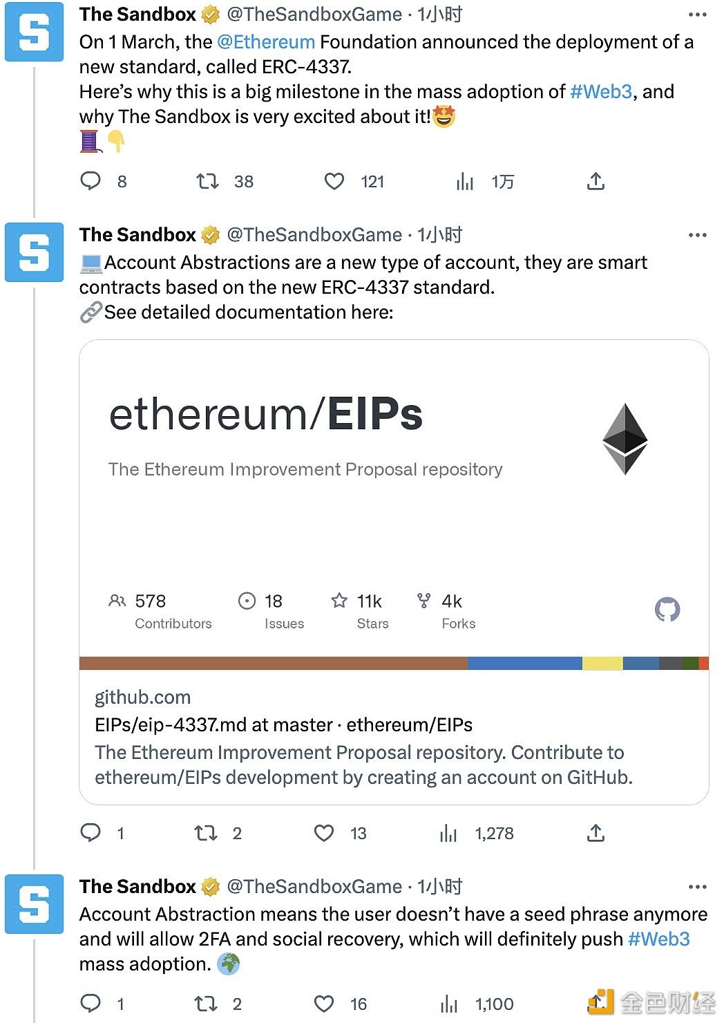 The Sandbox在社交媒体发文表示,看好以太坊基金会部署ERC-4337标准,尤其是基于该标准的智能合约将涉及到账户抽象新型账户,允许项目为用户支付交易gas费用或让用户选择代币进行支付。 目前The Sandbox已支持该功能,The Sandbox计划在未来几个月内探索ERC-4337标准以简化区块链游戏用户体验。