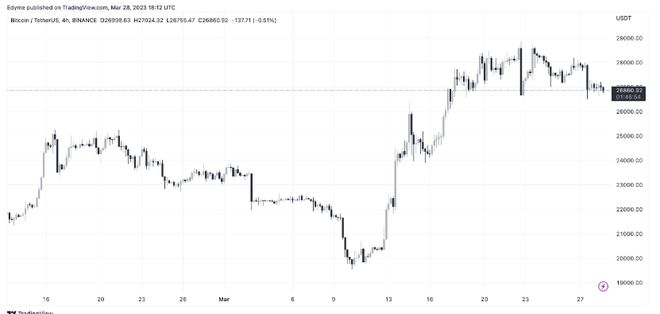 比特币 (BTC) 目前正经历下跌趋势,以响应美国当局最近针对加密货币市场主要参与者的监管行动。BTC 一直难以突破其 28,700 美元的重要阻力位,导致一些投资者认为回调对市场上最大的加密货币来说是健康的。