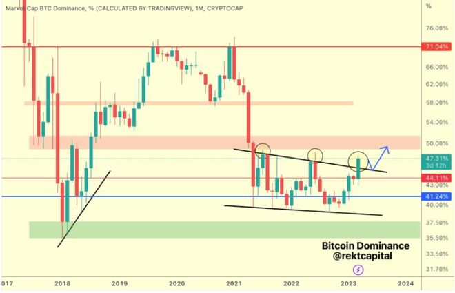 根据 Rekt 的说法,比特币的主导地位是自 2021 年 5 月以来一直存在的 Back Wedge 结构。分析师认为,比特币的主导地位也处于确认突破该结构的有利位置,月度收盘价可能超过自 5 月以来的下降趋势阻力位2021.