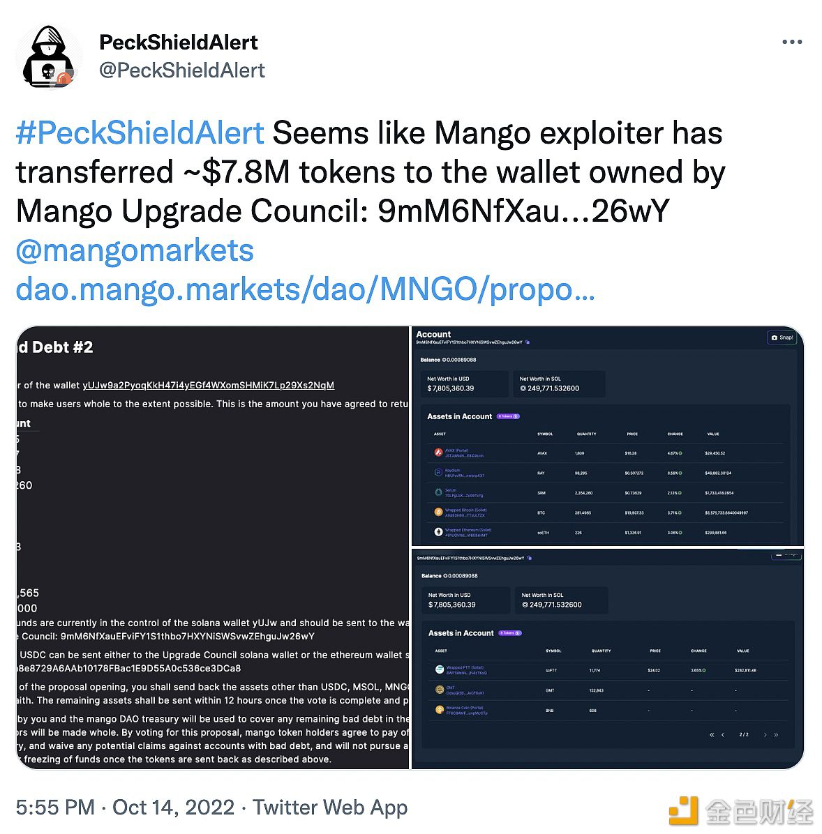 10月14日消息,据派盾(PeckShield)监测,Mango攻击者将价值约780万美元的代币转至Mango升级委员会(Mango Upgrade Council)控制的钱包9mM6NfXau…26wY中。