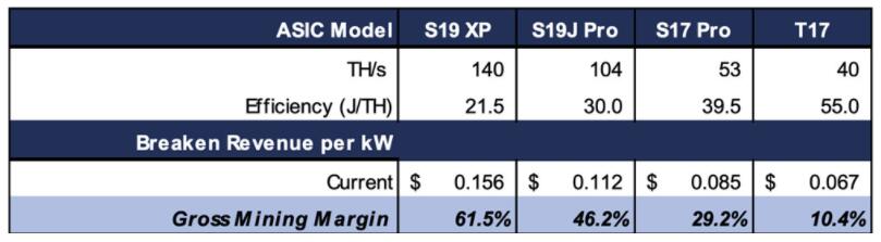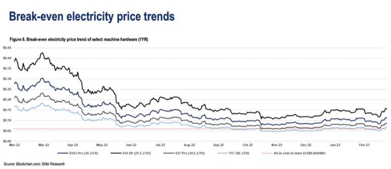 不过随着比特币价格的飙升,美国投行Stifel周一在一份分析报告中表示「今年的第一季度将成为一个更好的季度」。根据下图,同样单位的每秒算力下消耗50瓦电力设备的盈亏平衡电价,一直在一度电0.06美元左右。