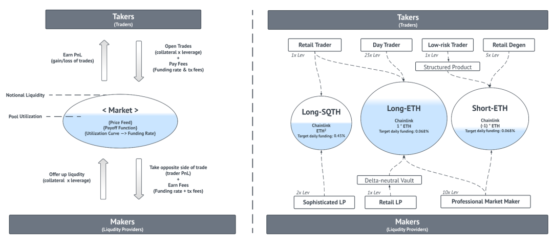 Lighter,由 a16z 支持的衍生品协议,机制不详。 Vest Exchange,由 Jane Street 支持的类 GMX fork。 Perennial Labs,推出的由合成资产支持的 AMM 衍生品市场,很多机制非常类似 GMX 的 X4 版本,但底层是 Opyn。这里面最值得期待的莫过于 Perennial。具体来讲,Perennial 提供了一个无需许可的建立衍生品市场的工具,而并非是单纯的提供交易市场。其设置了一套衍生品的交易规则,并允许任何人去设置其中的关键参数来建立自己的市场。