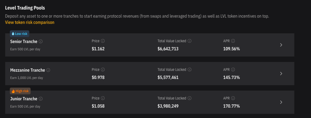 BNBChain 上的 Level Finance 也是一个十分有特色 GMX fork 协议。Level 利用分级基金的思路,为不同的比例的一揽子资产赋予了不同的激励与收入分配,为用户提供了多种配比的 ETF 选择。