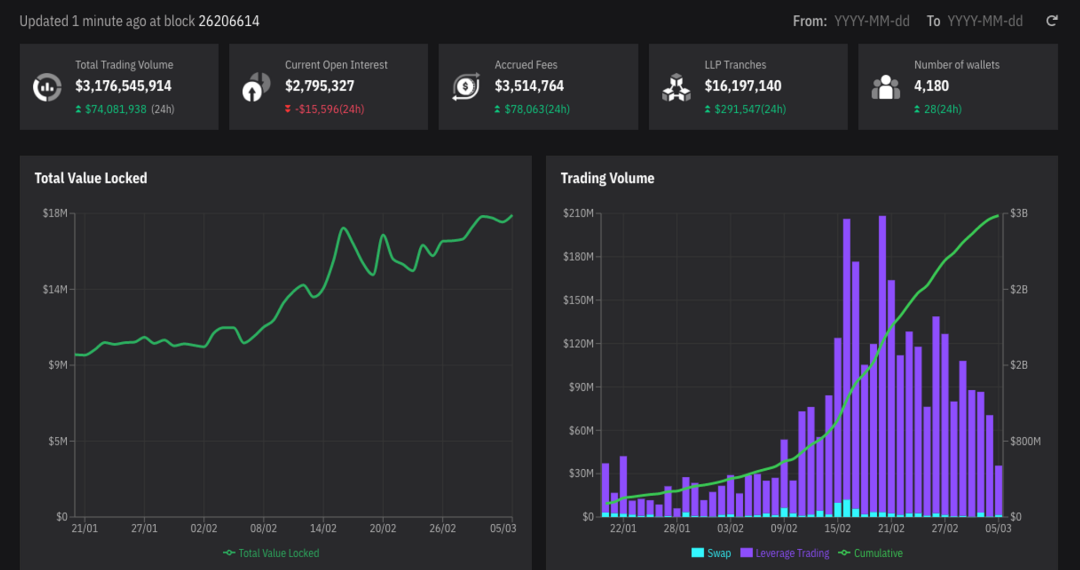 截至目前 (数据均为 3 月 5 日),Mummy finance 的平台交易量已超过 4 亿美金, MLP 已有近 1500 万美金的 TVL,产生了约 78 万美金的费用,数据并不亮眼。