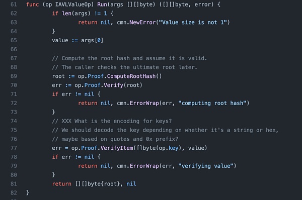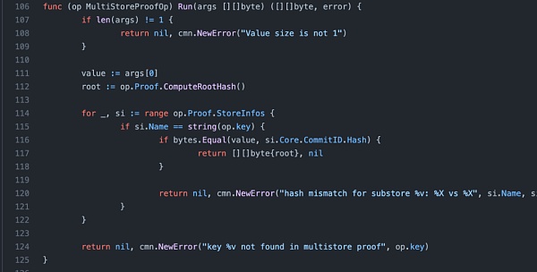 2. 验证主要由 IAVLValueOp 与 MultiStoreProofOp 两个 op 进行,IAVLValueOp 会先通过 ComputeRootHash 计算 roothash 并进行验证。验证通过后会将输出的 roothash 给到 MultiStoreProofOp,MultiStoreProofOp 将检查获得的 roothash 是否与 lightClient 获得的一致。