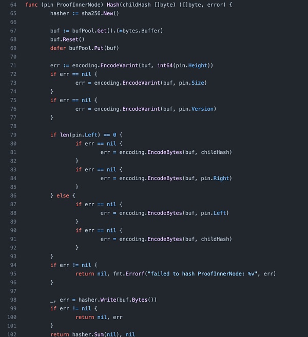 4. 而在具体的 leafnode 与 innernode 的哈希计算中我们可以看到当 left 为空时将计算 leaf 与 right 的 hash,当 right 为空时将计算 leaf 与 left 的 hash。但当 left 与 right 都存在的情况下,那么将忽略 right,计算 leaf 与 left 的 hash,即 roothash 将不会受 right 影响。