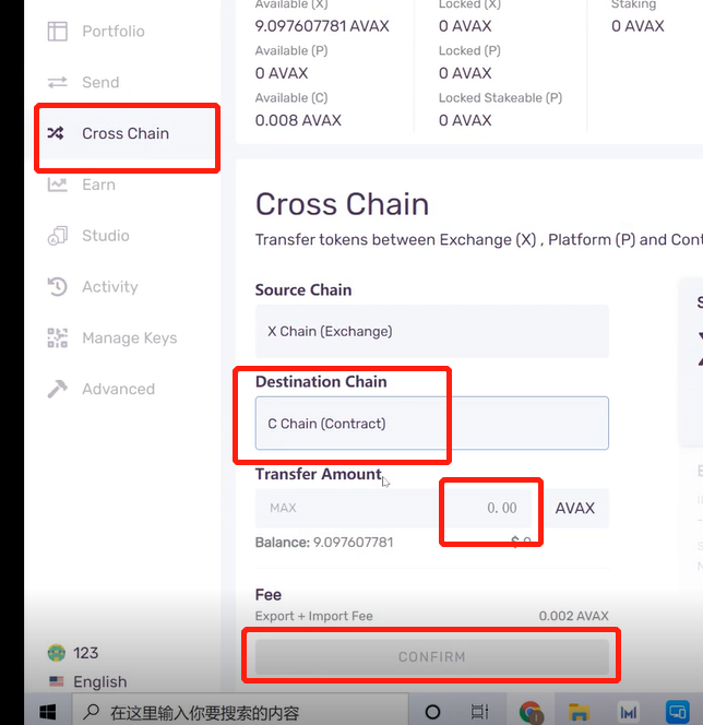 2、点击Avalanche钱包左侧的Cross Chain——目的链选择C链——填入要转入的金额,点击CONFIRM即可完成