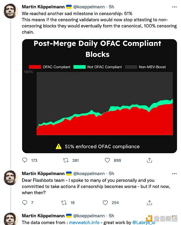 以太坊基础设施公司Gnosis联合创始人Martin Köppelmann在社交媒体上称,我们达到了审查制度的另一个可悲的里程碑。51%这意味着如果审查的验证者现在停止对非审查区块的证明,他们将最终形成规范的、100%的审查链。亲爱的Flashbots团队,我亲自与你们中的许多人交谈过,如果审查制度变得更糟,你们承诺会采取行动,但如果不是现在,那么什么时候?