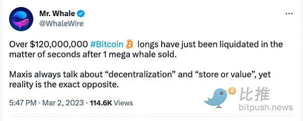 加密评论家“Mr Whale” 则指责鲸鱼抛售并导致暴跌:“在 1 个巨鲸抛售后的几秒钟内,超过 1.2 亿美元的比特币多头头寸被清算,比特币支持者总是谈论“去中心化”和“价值存储”,但现实恰恰相反”。