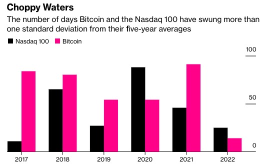 这带来的一个令人惊讶的结果是,至少在短期内它变得比美国股票的波动性更小。数据显示,根据5年来的价格变动,截至上周,比特币今年迄今只有14次偏离其平均价格的一个标准偏差以上。相比之下,以科技股为主的纳斯达克100指数的市盈率为25倍。