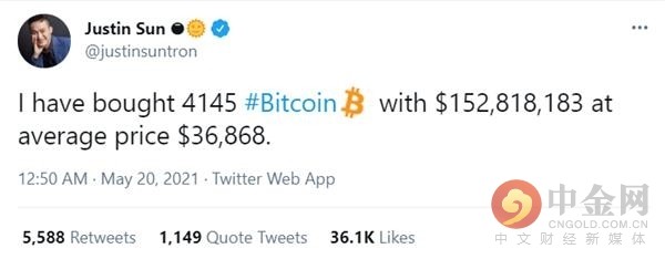 躲过暴跌之后,今天,孙在推特上表示自己已经“抄底买入”,以36868美元的均价买入1.53亿美元的比特币,以2509美元的均价买入1.35亿美元的以太坊。