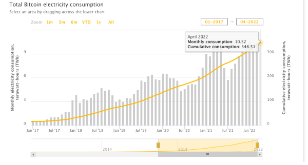 CBECI最新统计数字数据显示,2022年4月比特币电力耗能为1h.52 TWh(亿千瓦),2022年1月达到10.56TWh(亿千瓦),为历史最高;自2017年1月以来,比特币电力总耗能为346 TWh(亿千瓦)。